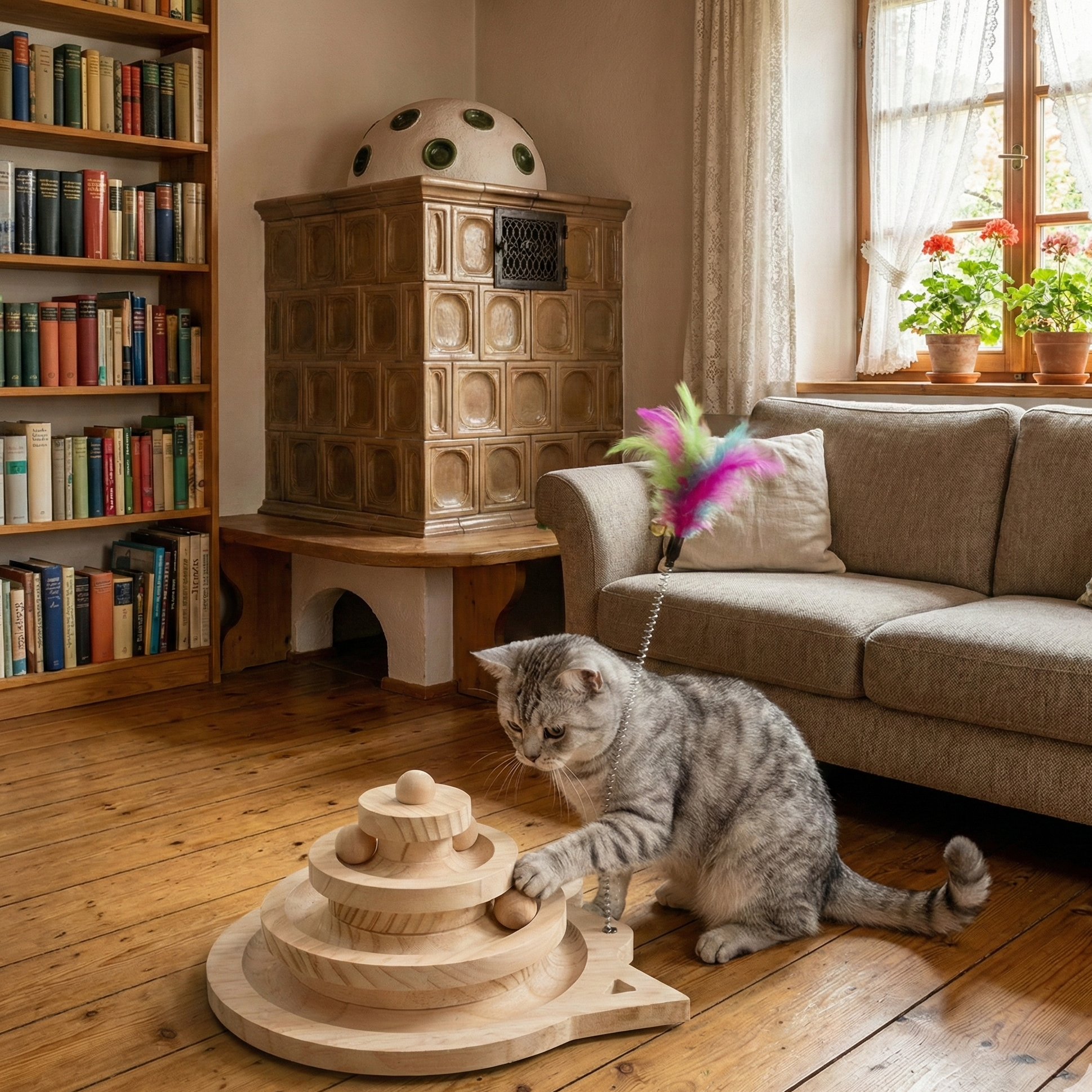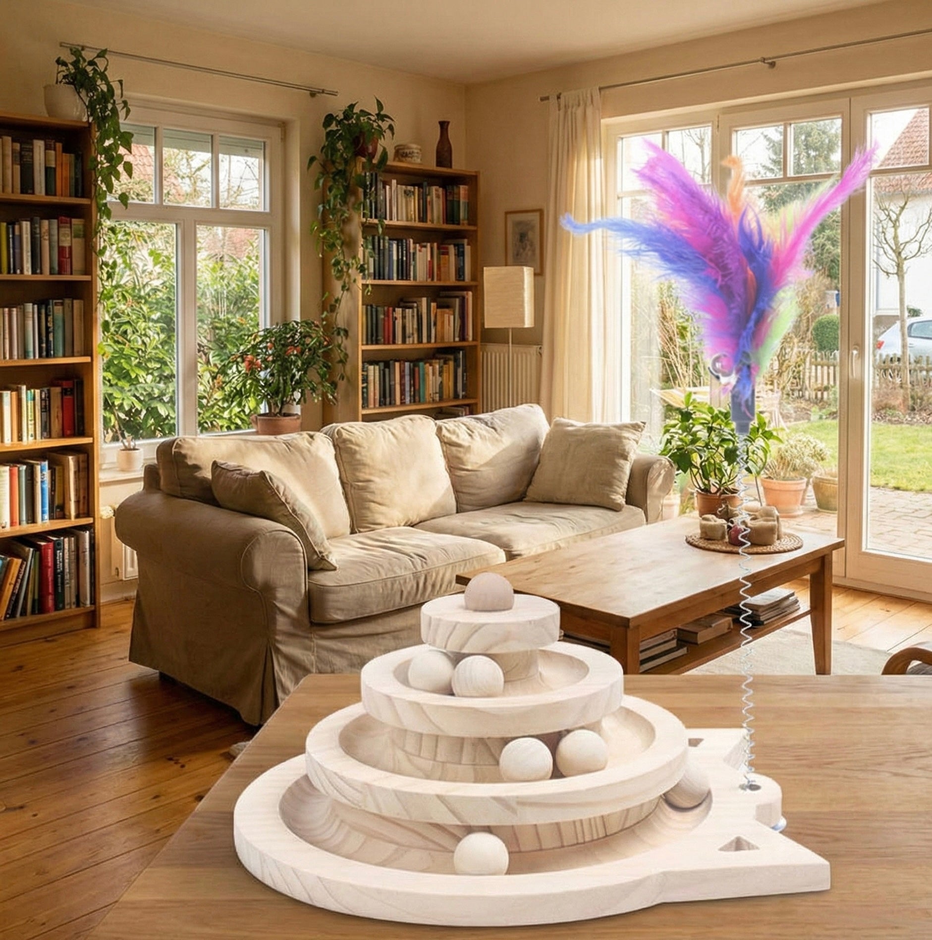 Dieser hochwertige Katzenspielturm aus Holz bietet Ihrem Stubentiger dreifachen Spielspaß auf drei Ebenen. Die intelligent gestalteten Bahnen mit bunten Bällen fördern den natürlichen Spieltrieb Ihrer Katze und sorgen für lang anhaltende Unterhaltung. Perfekt für alleiniges Spielen oder gemeinsame Trainingsstunden.